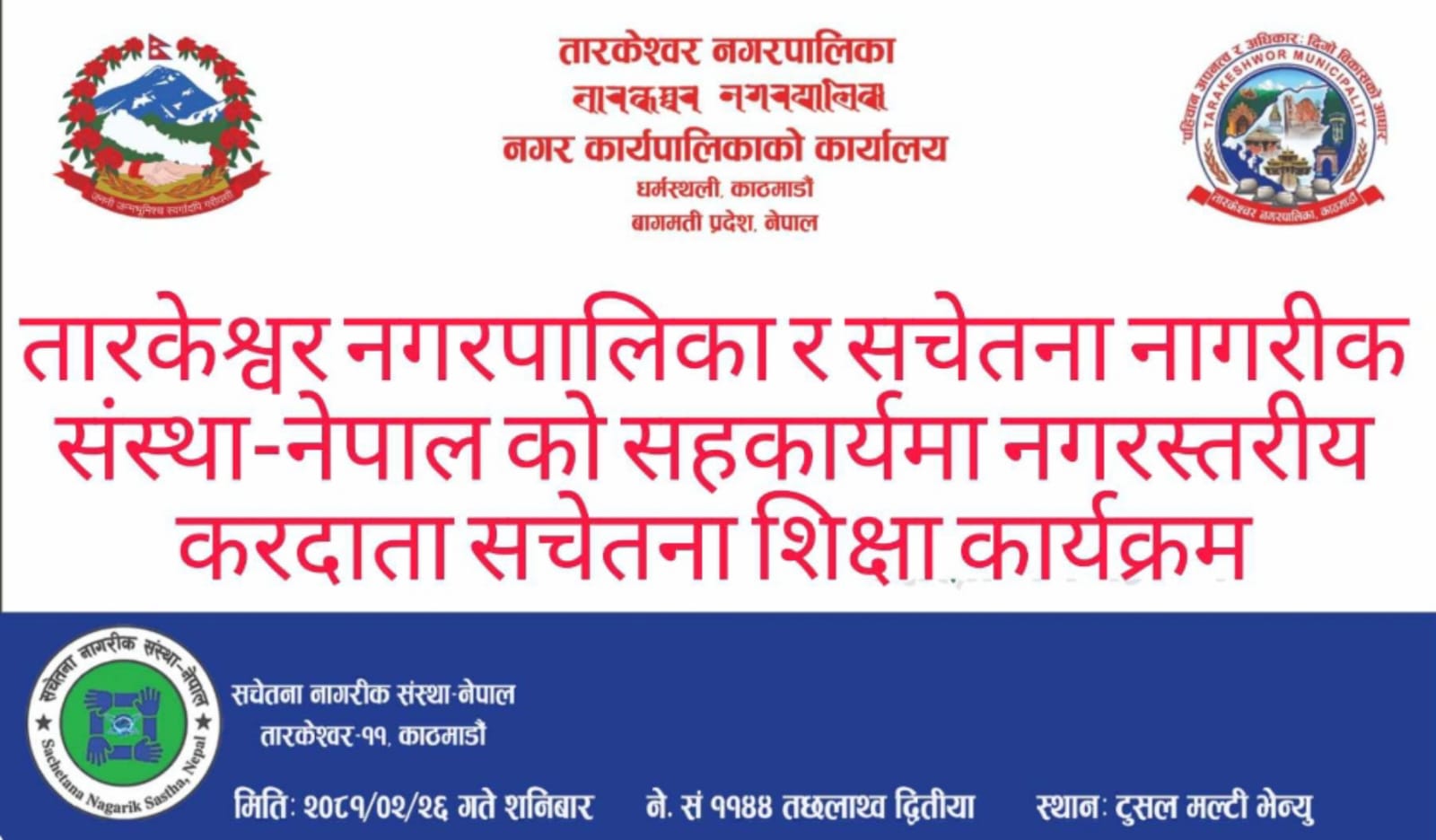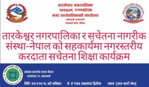 समाजमा रहेको व्यापक भ्रष्टाचार व्यथिति र अव्यवस्थित प्रकृयालाई जरैबाट उखेलेर फाल्न पर्छ भन्ने मान्यता राखेर गठन भएको “सचेतना नागरिक संस्था” नेपालले अब स्थानिय तहमा स्थानिय जनतालाई करदाता सचेतना शिक्षा तालिम कार्यक्रममा तारकेश्वर नगरपालिका सङ्ग मिलेर काम गर्ने भएको छ ।